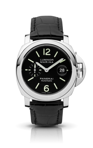 The Panerai Luminor Marina PAM00104 is a classic model featuring a cushion-shaped case and iconic crown-guard design. It has a solid weight, appears larger than its 44mm case due to the crown guard design, and maintains a great wrist feel and refined aesthetic.